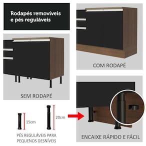 Outro diferencial desta cozinha são os pés reguláveis em PVC e os rodapés removíveis em MDP, que facilitam a limpeza. O balcão comporta pias de inox ou pedra, no espaço de 150 x 52 cm.