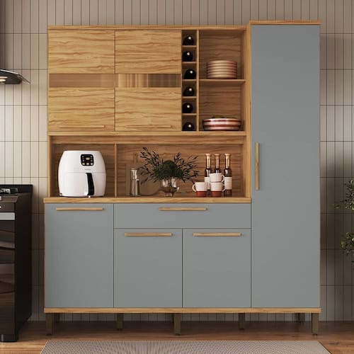 Transforme seu lar com a Cozinha Compacta Suécia! Com estrutura em 100% MDF, possui mini adega, 6 portas, sendo as 2 superiores com vidro reflecta, ajudando na iluminação, 1 gaveta grande com divisórias e espaço interno bem distribuído, tudo projetado para otimizar sua organização, garantindo praticidade e eficiência. Adicione elegância e funcionalidade à sua cozinha com essa cozinha versátil e sofisticada. Compre agora e renove seu ambiente! Acabamento da Prateleira: Pintura UV Escala de Brilho da Prateleira: Semi-Brilho Acabamento da Gaveta: Pintura UV Escala de Brilho da Gaveta: Semi-Brilho Material do Puxador da Gaveta: MDF Acabamento da Porta: Pintura UV Escala de Brilho da Porta: Semi-Brilho Material do Puxador da Porta: MDF Acompanha Tampo: Sim Altura dos Pés: 17 cm Altura Máxima dos Pés: 17.0000 Ambiente Principal: Cozinha Balcão Suporta Pia: Não codigo_ean: 7900288093813 Complexidade da Montagem: Alta: deve ser montado por um montador especializado Cor: Amêndoa/Cinza Cor do Produto: Amêndoa/Cinza Cor Interna: Amêndoa Escala de Brilho: Semi-Brilho Espessura do Tampo: 1,5 mm Gaveta com Chave: Não Itens Inclusos: 1 Cozinha Compacta, 1 Kit Ferragens, 1 Manual de Montagem Linha ou Coleção: Suécia Manual de Montagem e Instalação: https://product-hub-prd.madeiramadeira.com.br/982035/documents/6b1e062e-8179-4b7e-bc98-ae1b83184aa644711742471480982035150320.pdf Marca: Espresso Móveis Material da Dobradiça/Corrediça da Porta: Metálica Material da Gaveta: MDF Material da Porta: MDF Material da Prateleira: MDF Material do Fundo: MDF Material do Tampo: MDF Material dos Pés: ABS modular: Não Necessita Montagem: Sim O Balcão Acompanha Pia: Não Origem do Produto: Nacional Pés Reguláveis: Sim Peso: 96,37 kg Peso Máximo por Gaveta: 5 kg Peso Máximo por Prateleira: 5 kg Possui Pés: 08 Possui Portas: Sim Possui Prateleiras: Sim Possui recorte para Cooktop: Não Possui Rodízio: Não Possui Vidro: Sim Produto Montado: Sim Recomendações de Uso, Manutenção e Limpeza: Para limpeza utilize somente pano limpo e macio, ligeiramente umidecido em água (apenas o bastante para remover a poeira), seguido de um pano seco. Sapatas Niveladoras: Sim Sistema de Montagem: Parafusos, corrediças, conjuntos minifix, cavilha madeira, acessórios plásticos/metálicos Suporta Até (kg): 60 kg Tamanho Indicado da Pia: Não é recomendado o uso de pia. Tamanho Indicado do Tampo ou Pia: 132.4 Tipo de Corrediça da Gaveta: Metálica Telescópica Tipo de Dobradiça da Porta: Simples Tipo de Puxador da Gaveta: Externo Tipo de Puxador da Porta: Externo