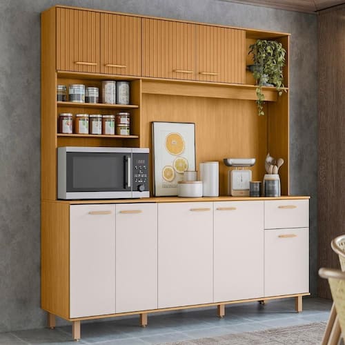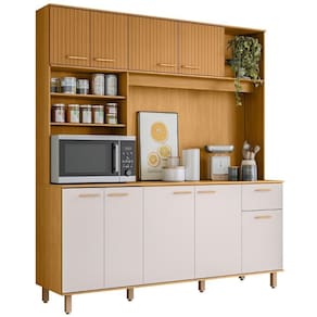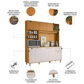 A Cozinha Compacta é composta por nove portas, sendo as quatro na parte superior com detalhe em ripado gráfico, que combina com diversos estilos de decoração. Inclui também uma gaveta com corrediças telescópicas que garantem uma abertura total e fácil acesso aos itens armazenados. Conta ainda com um compartimento para micro-ondas ou forno elétrico e três nichos decorativos para acomodar temperos e exibir seus itens favoritos.