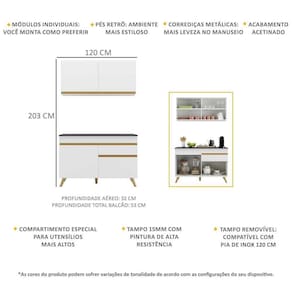 Altura: 203cm | Largura: 120cm | Profundidade: 32cm (aéreos) - 53cm (balcão com tampo)