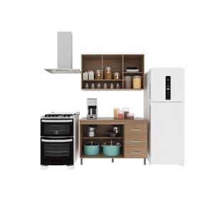 Os módulos são avulsos (cada peça é independente uma da outra) possibilitando assim vários arranjos, o espaço interno, que vem com prateleiras e divisórias, é ótimo para organização dos utensílios e mantimentos. Fabricados em material resistente, como chapas de MDP 15mm, corrediças telescópicas e dobradiças metálicas. Com puxadores cromados em ABS, pés em plástico com regulagem de altura.