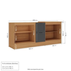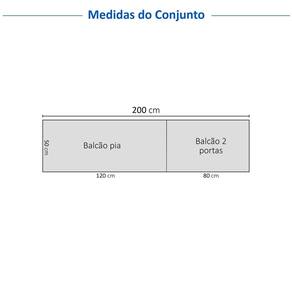 Medida de cada item (A x L x P): Balcão 2 portas 2 gavetas (sem tampo): 83,5cm x 120cm x 50cm; Balcão 2 portas (com tampo): 86cm x 80cm x 50cm.