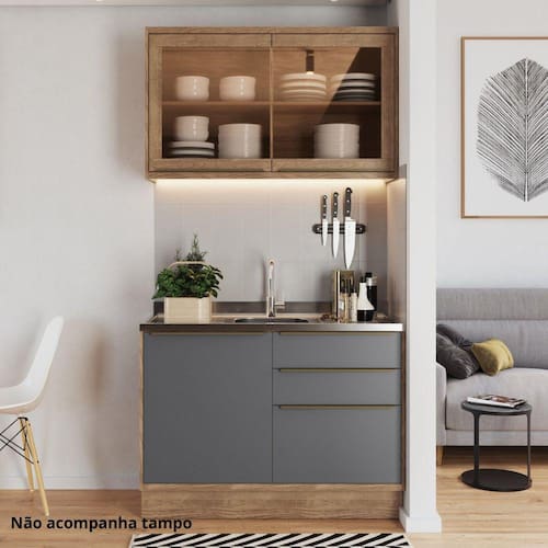 A Cozinha Compacta 2 Peças Viena é composta por peças essenciais para sua cozinha. Com estilo moderno e sofisticado, agrega beleza ao ambiente. Todos os puxadores são em alumínio champanhe e as dobradiças possuem amortecimento, de forma que proporcione resistência e funcionalidade ao produto. Além do mais, todas as portas são finalizadas em BP, que permite que os móveis tenham desenhos exclusivos, acabamentos detalhados e texturas especiais. Acabamento da Prateleira: Pintura Escala de Brilho da Prateleira: Semi-Brilho Acabamento da Gaveta: Pintura Escala de Brilho da Gaveta: Semi-Brilho Material do Puxador da Gaveta: Cromado Acabamento da Porta: BP Escala de Brilho da Porta: Semi-Brilho Material do Puxador da Porta: Cromado Acabamento dos Pés: Pintura Acompanha Tampo: Não Altura dos Pés: 14,5 cm Altura Máxima dos Pés: 14.5000 Ambiente Principal: Cozinha codigo_ean: 7909903556832 Complexidade da Montagem: Alta: deve ser montado por um montador especializado Cor: Freijó / Grafite Cor do Produto: Freijó / Grafite Cor Interna: Freijó Escala de Brilho: Semi-Brilho Gaveta com Chave: Não Itens Inclusos: 1 Balcão Inferior 120, 1 Aéreo e 1 Manual de Montagem Linha ou Coleção: Viena Manual de Montagem e Instalação: https://product-hub-prd.madeiramadeira.com.br/883365/documents/6c9a072a-d57b-45d8-b034-923a5d63f8b31725169ilovepdfmerged.pdf Material da Dobradiça/Corrediça da Porta: Metálica Material da Gaveta: MDF Material da Porta: MDF Material da Prateleira: MDF Material do Fundo: MDF Material dos Pés: MDF Medida de cada item (A x L x P): Balcão Inferior: L 120cm x A 86,5cm x P 52,5cm; Aéreo: L 120cm x A 72cm x P 33,5cm modular: Sim Necessita Montagem: Sim O Balcão Acompanha Pia: Não Origem do Produto: Nacional Pés Reguláveis: Não Peso: 79 kg Peso Máximo por Gaveta: 5 kg Peso Máximo por Prateleira: 5 kg Possui Pés: Rodapé Possui Portas: Sim Possui Prateleiras: Sim Possui recorte para Cooktop: Não Possui Rodízio: Não Possui Vidro: Sim Produto Montado: Sim Recomendações de Uso, Manutenção e Limpeza: Recomenda-se a utilização de pano seco. Sapatas Niveladoras: Sim Sistema de Montagem: Parafuso e Minifix Suporta Até (kg): 0 kg Tamanho Indicado da Pia: 120cm Tamanho Indicado do Tampo: 120cm Tipo de Corrediça da Gaveta: Metálica Telescópica Tipo de Dobradiça da Porta: 35 mm Tipo de Puxador da Gaveta: Externo Tipo de Puxador da Porta: Externo