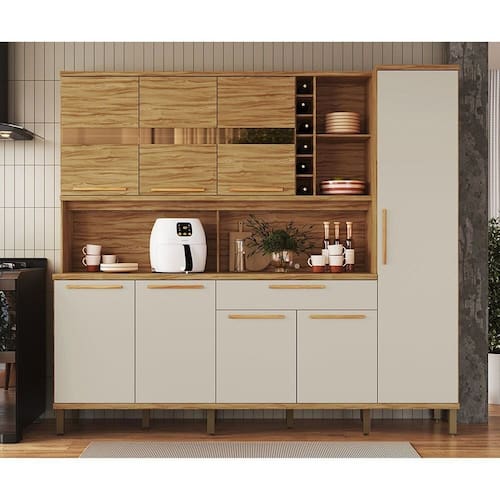 Transforme seu lar com a Cozinha Compacta Suécia! Com estrutura em 100% MDF, possui mini adega, 8 portas, sendo as 3 superiores com vidro reflecta, ajudando na iluminação, 1 gaveta grande com divisórias e espaço interno bem distribuído, tudo projetado para otimizar sua organização, garantindo praticidade e eficiência. Adicione elegância e funcionalidade à sua cozinha com essa cozinha versátil e sofisticada. Compre agora e renove seu ambiente! Acabamento da Prateleira: Pintura UV Escala de Brilho da Prateleira: Semi-Brilho Acabamento da Gaveta: Pintura UV Escala de Brilho da Gaveta: Semi-Brilho Material do Puxador da Gaveta: MDF Acabamento da Porta: Pintura UV Escala de Brilho da Porta: Semi-Brilho Material do Puxador da Porta: MDF Acompanha Tampo: Sim Altura dos Pés: 17 cm Altura Máxima dos Pés: 17.0000 Ambiente Principal: Cozinha Balcão Suporta Pia: Não codigo_ean: 7900288093868 Complexidade da Montagem: Alta: deve ser montado por um montador especializado Cor: Amêndoa/Off White Cor do Produto: Amêndoa/Off White Cor Interna: Amêndoa Escala de Brilho: Semi-Brilho Espessura do Tampo: 1,5 mm Gaveta com Chave: Não Itens Inclusos: 1 Cozinha Compacta, 1 Kit Ferragens, 1 Manual de Montagem Linha ou Coleção: Suécia Manual de Montagem e Instalação: https://product-hub-prd.madeiramadeira.com.br/982037/documents/7262cfe5-727b-444b-bf84-973d5fd12fa944761742471483982037150375.pdf Marca: Espresso Móveis Material da Dobradiça/Corrediça da Porta: Metálica Material da Gaveta: MDF Material da Porta: MDF Material da Prateleira: MDF Material do Fundo: MDF Material do Tampo: MDF Material dos Pés: ABS modular: Não Necessita Montagem: Sim O Balcão Acompanha Pia: Não Origem do Produto: Nacional Pés Reguláveis: Sim Peso: 116,65 kg Peso Máximo por Gaveta: 5 kg Peso Máximo por Prateleira: 5 kg Possui Pés: 10 Possui Portas: Sim Possui Prateleiras: Sim Possui recorte para Cooktop: Não Possui Rodízio: Não Possui Vidro: Sim Produto Montado: Sim Recomendações de Uso, Manutenção e Limpeza: Para limpeza utilize somente pano limpo e macio, ligeiramente umidecido em água (apenas o bastante para remover a poeira), seguido de um pano seco. Sapatas Niveladoras: Sim Sistema de Montagem: Parafusos, corrediças, conjuntos minifix, cavilha madeira, acessórios plásticos/metálicos Suporta Até (kg): 70 kg Tamanho Indicado da Pia: Não é recomendado o uso de pia. Tamanho Indicado do Tampo ou Pia: 176.5 Tipo de Corrediça da Gaveta: Metálica Telescópica Tipo de Dobradiça da Porta: Simples Tipo de Puxador da Gaveta: Externo Tipo de Puxador da Porta: Externo