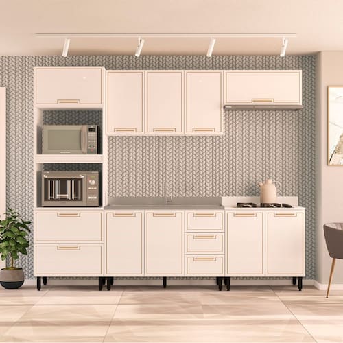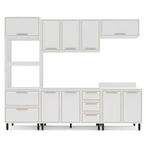 Características: Estrutura MDP Pintura FF/UV 07 Portas com dobradiças metálicas 03 Portas com pistão à gás 04 Gavetas com corrediças telescópicas Puxadores em Alumínio 13 Pés em Plástico Acabamento usinado Possui prateleiras com amplo espaço Peso suportado nas Prateleiras Estruturais: 10kg Peso suportado nas Prateleiras: 5kg Peso suportado nas Gavetas: 3kg *Não acompanha Tampo*