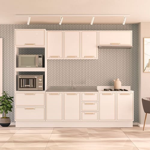 Características: Estrutura MDP Pintura FF/UV 07 Portas com dobradiças metálicas 03 Portas com pistão à gás 04 Gavetas com corrediças telescópicas Puxadores em Alumínio Acabamento usinado Possui prateleiras com amplo espaço Possui Rodapé Peso suportado nas Prateleiras Estruturais: 10kg Peso suportado nas Prateleiras: 5kg Peso suportado nas Gavetas: 3kg *Não acompanha Tampo*