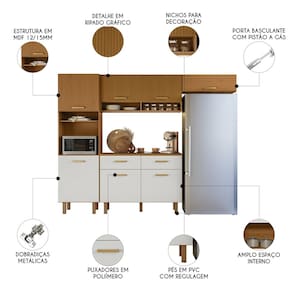 O Armário Aéreo dispõe de duas portas com detalhe em ripado gráfico e dois nichos para temperos e itens decorativos. Para completar, o Armário de Geladeira traz uma porta basculante com pistão a gás, que facilita o manuseio. Com uma prateleira interna, a Cozinha Compacta possui amplo espaço para acomodar utensílios, louças e mantimentos.
