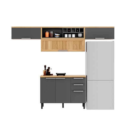 Pensada para diferentes tamanhos de cozinha, a New Porto se adapta tanto a ambientes amplos quanto compactos. Os pés reguláveis garantem fácil nivelamento, enquanto as dobradiças metálicas de 35mm oferecem resistência e estabilidade ao uso diário. Com prateleiras bem distribuídas e soluções inteligentes, como gavetas com divisor de talheres e compartimentos internos, essa cozinha proporciona praticidade, beleza e exclusividade para transformar sua rotina. Informações adicionais: Produto entregue desmontado, com manual de montagem incluso