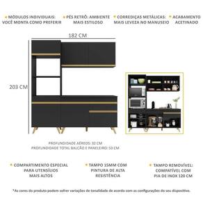 Dimensões do produto montado: Cozinha - Altura: 203cm | Largura: 182cm | Profundidade: 32cm (aéreo) - 53cm (paneleiro e balcão com tampo) *Você pode consultar as medidas internas na imagem técnica do produto.
