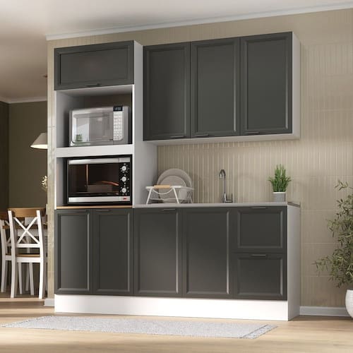 Com amplo espaço interno e gavetas de deslizamento suave graças às corrediças telescópicas, ele é ideal para organizar sua cozinha de forma eficiente. As portas robustas possuem dobradiças reforçadas de 35mm e o armário aéreo com pistão a gás é perfeito para instalação sobre geladeiras ou fogões. Os puxadores em alumínio com pintura epóxi oferecem um toque de design contemporâneo e resistência ao uso diário. Os pés em PVC de 14,5 cm são ajustáveis para maior estabilidade, e os rodapés removíveis facilitam a limpeza do dia a dia.