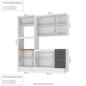 Medida de cada item (A x L x P): Torre Quente: 213cm x 70cm x 50cm; Aéreo triplo: 76cm x 120cm x 31cm; Balcão: 84cm x 120cm x 50cm.