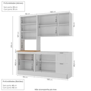 Medida de cada item (A x L x P): Paneleiro Duplo: 213cm x 70cm x sup 31cm/inf 50cm; Aéreo triplo: 76cm x 120cm x 31cm; Balcão 2 portas 2 gavetas (sem tampo): 83,5cm x 120cm x 50cm;