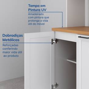 Informações Complementares: Portas de bater almofadadas/molduradas em MDF sendo 02 portas com detalhe em vidro incolor 3mm, balcão 120cm sem tampo para pia de 120cm, corrediças telescópicas, dobradiças de 35mm, prateleiras internas, puxadores de alumínio, espaço para micro-ondas, pé