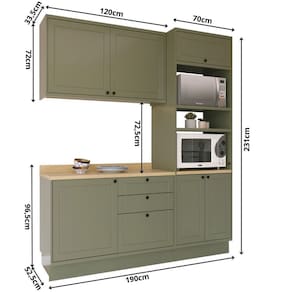 A Cozinha Compacta 3 Peças Sevilha é composta por peças essenciais para sua cozinha. Com estilo moderno e sofisticado, agrega beleza ao ambiente. Todos os puxadores são metálicos e pontuais e as dobradiças possuem amortecimento, de forma que proporcione resistência e funcionalidade ao produto. A Cozinha é produzida 100% em MDF, além de possuir corrediças telescópicas nas gavetas que proporcionam maior abertura e um deslizamento suave e silencioso. Acompanha o tampo em MDF. Acabamento da Prateleira: Pintura UV Escala de Brilho da Prateleira: Semi-Brilho Acabamento da Gaveta: Pintura Escala de Brilho da Gaveta: Semi-Brilho Material do Puxador da Gaveta: Metal Acabamento da Porta: Pintura UV Escala de Brilho da Porta: Semi-Brilho Material do Puxador da Porta: Metal Acabamento dos Pés: Pintura Acompanha Tampo: Sim Altura dos Pés: 13 cm Ambiente Principal: Cozinha Complexidade da Montagem: Alta: deve ser montado por um montador especializado Cor: Verde Hill /Carvalho Marrom Cor do Produto: Verde Hill /Carvalho Marrom Cor Interna: Verde Hill Escala de Brilho: Semi-Brilho Espessura do Material da Estrutura: 15 mm Espessura do Tampo: 30 mm Gaveta com Chave: Não Itens Inclusos: 1 Balcão 120cm , 1 Aéreo 120cm, 1 Torre Quente 70cm, 1 Tampo 120cm e 1 Manual de Montagem. Linha ou Coleção: Sevilha Manual de Montagem e Instalação: https://product-hub-prd.madeiramadeira.com.br/950504/documents/fb6fdc30-5ef4-42d2-b112-9de825a344b62354570489017267555611406.pdf Material da Dobradiça/Corrediça da Porta: Metálica Material da Gaveta: MDF Material da Porta: MDF Material da Prateleira: MDF Material do Fundo: MDF Material do Tampo: MDF Material dos Pés: MDF Medida de cada item (A x L x P): Balcão: L 120cm x A 86,5cm x P 52cm; Aéreo: L 120cm x A 72cm x P 33,5cm; Torre Quente: L 70cm x A 231cm x P 52cm; Tampo: L 120cm x A 10cm x P 52,5cm modular: Sim Necessita Montagem: Sim O Balcão Acompanha Pia: Não Origem do Produto: Nacional Pés Reguláveis: Não Peso: 158,751 kg Peso Máximo por Gaveta: 5 kg Peso Máximo por Prateleira: 5 kg Possui Pés: Rodapé Possui Portas: Sim Possui Prateleiras: Sim Possui recorte para Cooktop: Não Possui Rodízio: Não Possui Vidro: Não Recomendações de Uso, Manutenção e Limpeza: Recomenda-se a utilização de pano seco. Sapatas Niveladoras: Sim Sistema de Montagem: Parafuso e Minifix Suporta Até (kg): 60 kg Tamanho Indicado da Pia: 120cm Tamanho Indicado do Tampo ou Pia: 120cm Tipo de Corrediça da Gaveta: Metálica Telescópica Tipo de Dobradiça da Porta: 35 mm Tipo de Puxador da Gaveta: Externo Tipo de Puxador da Porta: Externo