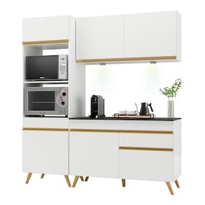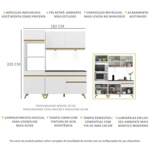 A Cozinha Compacta 3 peças com Leds MP2019 Veneza Up Multimóveis tem um excelente custo benefício e um amplo espaço interno. Produzida em MDP com acabamento acetinado (cerca de 20% de brilho), que garante maior durabilidade e resistência, possui corrediças metálicas (mais leveza no manuseio), pés retrô em polipropileno, que deixam o ambiente mais estiloso, puxadores em ABS e tampo em MDP 15mm com pintura de alta resistência. Os módulos são individuais e você pode montar da maneira que se adaptar melhor ao seu ambiente. O balcão possui tampo removível (compatível com pia de 120 cm). Para deixar sua cozinha mais bonita e organizada, possui módulo para forno e microondas, além de compartimento especial para utensílios mais altos. As luminárias em LED, que acompanham a cozinha, proporcionam um visual mais bonito e moderno, deixando o ambiente aconchegante e confortável. Com design minimalista e de fácil instalação, você pode escolher em qual lugar do móvel deseja fixar. Com luz brilhante, as luminárias funcionam com 3 pilhas AAA.