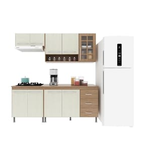 Os módulos são avulsos (cada peça é independente uma da outra) possibilitando assim vários arranjos, o espaço interno, que vem com prateleiras e divisórias, é ótimo para organização dos utensílios e mantimentos. Fabricados em material resistente, como chapas de MDP 15mm, corrediças telescópicas e dobradiças metálicas. Com puxadores cromados em ABS, pés em plástico com regulagem de altura.