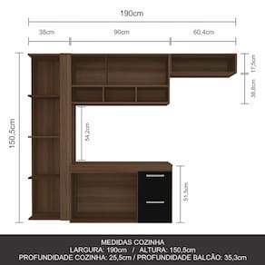 Medidas da Cozinha Montada: A:150,5cm | L:190cm | P:35,3cm