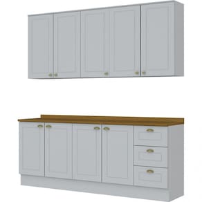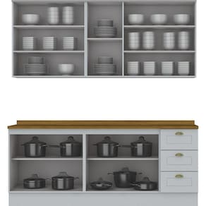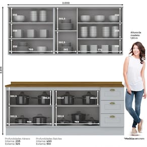 Um novo conceito inspirado nas clássicas cozinhas estilo americano, seu design contemporâneo embeleza qualquer ambiente. Projetado para proporcionar praticidade e funcionalidade ao uso. Produto 100% MDF, possui detalhes usinados em baixo relevo nas portas e gavetas, puxadores nos balcões em formato de concha e nos aéreos são pontuais, ambos na cor ouro velho, possui dobradiças de 35mm com amortecimento, aéreos com 830mm de alturas, gavetas com corrediças telescópicas proporcionando maior abertura. A sua instalação pode ser feita tanto com o uso dos rodapés ou suspensa. Este produto foi desenvolvido para atender os mais criteriosos usuários aliando funcionalidade com elegância. Acabamento da Prateleira: Pintura Texturizada UV Escala de Brilho da Prateleira: Fosco Acabamento da Gaveta: Pintura Texturizada UV Escala de Brilho da Gaveta: Fosco Material do Puxador da Gaveta: Metal Acabamento da Porta: Pintura Texturizada UV Escala de Brilho da Porta: Fosco Material do Puxador da Porta: Metal Acompanha Tampo: Sim Ambiente Principal: Cozinha Complexidade da Montagem: Alta: deve ser montado por um montador especializado Cor: Branco HP Cor do Produto: Branco HP Cor Interna: Trama Branco Escala de Brilho: Fosco Gaveta com Chave: Não Itens Inclusos: 1 Cozinha, Kit Ferragens e Manual de Montagem Linha ou Coleção: Emily Manual de Montagem e Instalação: https://cdn2.madeiramadeira.com.br/atributo/m-veis-henn/742193-478589-ce351-kit-de-cozinha-emily-4-pe-as-5.pdf Material da Gaveta: MDF Material da Porta: MDF Material da Prateleira: MDF Material do Fundo: MDF Material do Tampo: MDP Material dos Pés: MDF Medida de cada item (A x L x P): 1 Balcão 2 Portas 82cm x 80cm x 51cm c/tampo; 1 Balcão 2 Portas 3 Gavetas 82cm x 120cm x 51cm c/tampo; 1 Aéreo 2 Portas 83cm x 80cm x 32,5cm e 1 Aéreo 3 Portas 83cm x 120cm x 32,5cm Necessita Montagem: Sim O Balcão Acompanha Pia: Não Origem do Produto: Nacional Pés Reguláveis: Não Peso: 137 kg Peso Máximo por Gaveta: 3 kg Peso Máximo por Prateleira: 8 Possui Pés: Rodapé Possui Portas: 09 Possui Prateleiras: 07 Possui recorte para Cooktop: Não Possui Rodízio: Não Recomendações de Uso, Manutenção e Limpeza: Para limpeza de seu móvel, use uma flanela seca ou umedecida. Não utilize produtos químicos que possam danificar o produto. Sapatas Niveladoras: Não Sistema de Montagem: Parafusos e Cavilhas Suporta Até (kg): 177 kg Tamanho: Tipo de Corrediça da Gaveta: Metálica Telescópica Tipo de Dobradiça da Porta: Metálica Tipo de Puxador da Gaveta: Externo Tipo de Puxador da Porta: Externo