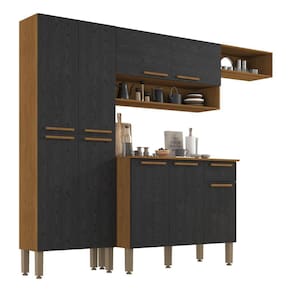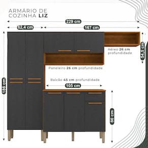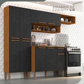 A Cozinha Compacta 4 peças 9 portas Liz Expresso Móveis tem um excelente custo-benefício e um amplo espaço interno. Produzida em MDP com pintura Touch UVTH, que garante maior durabilidade e resistência, possui corrediças telescópicas, garantindo abertura total da gaveta, pés com regulagem de altura em polipropileno, que deixam o ambiente mais estiloso, puxadores de madeira e tampo em MDP 15mm com pintura de alta resistência. Os módulos são individuais e você pode montar da maneira que se adaptar melhor ao seu ambiente. Acabamento da Prateleira: Pintura UV Escala de Brilho da Prateleira: Fosco Acabamento da Gaveta: Pintura UV Material do Puxador da Gaveta: MDF Acabamento da Porta: Pintura Texturizada UV Escala de Brilho da Porta: Fosco Acabamento dos Pés: Polipropileno Acompanha Tampo: Sim Altura dos Pés: 15 cm Ambiente Principal: Cozinha codigo_ean: 7909903358443 Complexidade da Montagem: Média: pode ser montado por mais de uma pessoa e/ou necessite de maior conhecimento para montagem Cor: Cinamomo/Preto Cor do Produto: Cinamomo/Preto Escala de Brilho: Fosco Espessura do Tampo: 15 mm Gaveta com Chave: Não Itens Inclusos: 1 Cozinha, Kit de Ferragem,manual de Montagem Manual de Montagem e Instalação: https://product-hub-prd.madeiramadeira.com.br/858873/documents/80593cd7-c75e-422e-b1da-b3a38e2ff1eemanualdemontagemcozinhaliz.pdf Material da Dobradiça/Corrediça da Porta: Metálica Material da Gaveta: MDF/MDP Material da Porta: MDP Material da Prateleira: MDP Material do Tampo: MDP Material dos Pés: Polipropileno Medida de cada item (A x L x P): Torre:60x186x29 | Aéreos: 162x51x26 | Balcão: 105x81,5x45 Necessita Montagem: Sim O Balcão Acompanha Pia: Não Origem do Produto: Nacional Pés Reguláveis: Sim Peso: 68,5 kg Peso Máximo por Gaveta: 5 kg Peso Máximo por Prateleira: 5 kg Possui Pés: 09 Possui Portas: Sim Possui Prateleiras: Sim Possui recorte para Cooktop: Não Possui Rodízio: Não Recomendações de Uso, Manutenção e Limpeza: Pano levemente umedecido e pano seco. Não utilizar produtos de limpeza Sapatas Niveladoras: Sim Sistema de Montagem: Parafusos Tamanho Indicado da Pia: Não se aplica Tipo de Corrediça: Metálica Telescópica Tipo de Corrediça da Gaveta: Telescópica Tipo de Dobradiça da Porta: Simples Tipo de Puxador: Externo Tipo de Puxador da Gaveta: Externo Tipo de Puxador da Porta: Externo