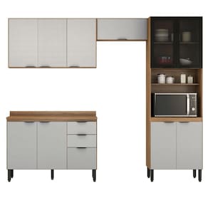 Compõe a cozinha: 1 Aéreo de geladeira 70cm porta basculante com pistão a gás, 1 Aéreo 3 portas 120cm com prateleiras internas, 1 Paneleiro 4 portas com 2 portas de vidro fume, 1 Balcão 120cm com 3 portas e 2 gavetas com tampo que pode ser substituído por pia.