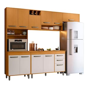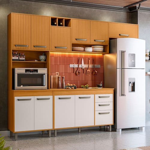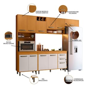 A Composição Malta acompanha a Cozinha Compacta 8 portas e o Balcão Flex 3 portas 2 gavetas, ambos da Poliman Móveis que oferecem design moderno e funcionalidade. A Cozinha possui um paneleiro duplo com 4 portas, nichos para micro-ondas e adega, além de um aéreo com porta basculante. O Balcão Flex é ideal para pia de 120x50cm, tem 3 portas, prateleira interna e 2 gavetas com corrediças telescópicas -tampo vendido separadamente-.