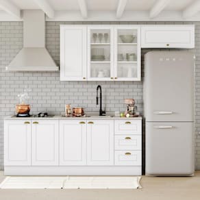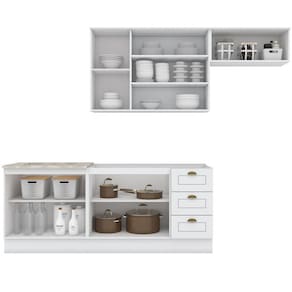 Cozinha Compacta Internacional 4 peças, possui 2.205mm de Altura, 2.800mm de Largura e 510mm de Profundidade. Um novo conceito inspirado nas clássicas cozinhas estilo americano, seu design contemporâneo embeleza qualquer ambiente. Projetado para proporcionar praticidade e funcionalidade ao uso. Produto 100% MDF, disponibiliza de várias opções de módulos que possibilitam diversas composições lineares, possui detalhes usinados em baixo relevo nas portas e gavetas, puxadores nos balcões em formato de concha e nos aéreos são pontuais, ambos na cor ouro velho, possui dobradiças de 35mm com amortecimento, aéreos com 830mm de alturas, gavetas com corrediças telescópicas proporcionando maior abertura. A sua instalação pode ser feita tanto com o uso dos rodapés ou suspensa. Acabamento da Prateleira: Pintura Texturizada UV Escala de Brilho da Prateleira: Fosco Acabamento da Gaveta: Pintura Texturizada UV Escala de Brilho da Gaveta: Fosco Material do Puxador da Gaveta: Metal Acabamento da Porta: Pintura UV Escala de Brilho da Porta: Fosco Material do Puxador da Porta: MDF Acabamento dos Pés: Pintura Acompanha Tampo: Não Ambiente Principal: Cozinha codigo_ean: 7908388192016 Complexidade da Montagem: Alta: deve ser montado por um montador especializado Cor: Branco Cor do Produto: Branco Escala de Brilho: Fosco Gaveta com Chave: Não Itens Inclusos: Paneleiro,Balcão,Aéreo Linha ou Coleção: Internacional - Henn Manual de Montagem e Instalação: https://product-hub-prd.madeiramadeira.com.br/627110/documents/dcee0d7c-b00e-42dd-8eab-49c4eeb9b069mericana4pscareopgeladeira.pdf Material da Dobradiça/Corrediça da Porta: Metálica Material da Gaveta: MDF Material da Porta: MDF Material da Prateleira: MDF Material do Fundo: MDF Material dos Pés: MDF Medida do Recorte para Cooktop: 51,5cm x 36cm modular: Sim Necessita Montagem: Sim O Balcão Acompanha Pia: Não Origem do Produto: Nacional Pés Reguláveis: Sim Peso: 114 kg Peso Máximo por Gaveta: 3 kg Peso Máximo por Prateleira: 8 kg Possui Pés: Rodapé Possui Portas: Sim Possui Prateleiras: Sim Possui recorte para Cooktop: Sim Possui Vidro: Sim Produto Montado: Sim Recomendações de Uso, Manutenção e Limpeza: Para limpeza de seu móvel, use uma flanela seca ou umedecida. Não utilize produtos químicos que possam danificar o produto. Resistente à Chuva: Não Sapatas Niveladoras: Não Sistema de Montagem: Parafusos e Cavilhas Tamanho Indicado da Pia: 120cm x 53,5cm Tamanho Indicado do Tampo: 120cm x 53,5cm Tamanho Indicado do Tampo ou Pia: 120cm x 53,5cm Tipo de Corrediça da Gaveta: Metálica Telescópica Tipo de Dobradiça/Corrediça da Porta: Soft close Tipo de Puxador da Gaveta: Externo Tipo de Puxador da Porta: Externo