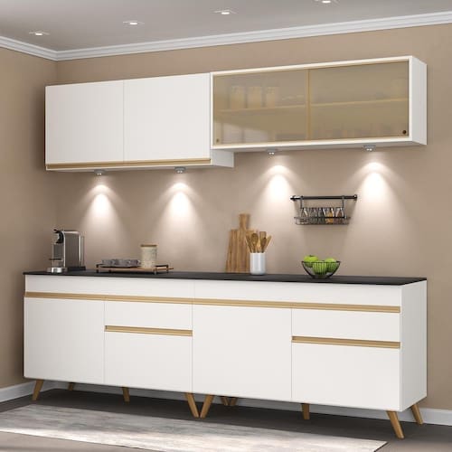 A Cozinha Compacta 4 peças com Leds MP2021 Veneza Up Multimóveis tem um excelente custo benefício e um amplo espaço interno. Produzida em MDP com acabamento acetinado (cerca de 20% de brilho), que garante maior durabilidade e resistência, possui corrediças metálicas (mais leveza no manuseio), pés retrô em polipropileno, que deixam o ambiente mais estiloso, puxadores em ABS e tampo em MDP 15mm com pintura de alta resistência. Os módulos são individuais e você pode montar da maneira que se adaptar melhor ao seu ambiente. O balcão possui tampo removível (compatível com pia de 120 cm). Para deixar sua cozinha mais bonita e organizada, possui vidro reflecta e compartimento especial para utensílios mais altos. As luminárias em LED, que acompanham a cozinha, proporcionam um visual mais bonito e moderno, deixando o ambiente aconchegante e confortável. Com design minimalista e de fácil instalação, você pode escolher em qual lugar do móvel deseja fixar. Com luz brilhante, as luminárias funcionam com 3 pilhas AAA.