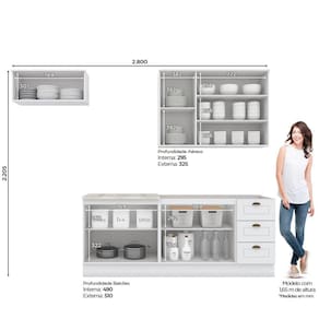 A Cozinha Compacta Emily 4 peças possui 220,5 cm de Altura, 280 cm de Largura e 51 cm de Profundidade. Um novo conceito inspirado nas clássicas cozinhas estilo americano, seu design contemporâneo embeleza qualquer ambiente. Projetado para proporcionar praticidade e funcionalidade ao uso. Produto 100% MDF, podendo ser adquirido em outras composições que podem adaptar-se melhor ao espaço disponível, possui detalhes usinados em baixo relevo nas portas e gavetas, puxadores nos balcões em formato de concha e nos aéreos são pontuais, ambos na cor ouro velho, possui dobradiças de 35mm com amortecimento, aéreos com 83 cm de altura, gavetas com corrediças telescópicas proporcionando maior abertura. A sua instalação pode ser feita tanto com o uso dos rodapés ou suspensa. Acabamento da Prateleira: Pintura Texturizada UV Escala de Brilho da Prateleira: Fosco Acabamento da Gaveta: Pintura Texturizada UV Escala de Brilho da Gaveta: Fosco Material do Puxador da Gaveta: Metal Acabamento da Porta: Pintura Texturizada UV Escala de Brilho da Porta: Fosco Material do Puxador da Porta: Metal Acabamento dos Pés: Pintura Acompanha Tampo: Não Altura dos Pés: 14.5 Ambiente Principal: Cozinha Complexidade da Montagem: Alta: deve ser montado por um montador especializado Cor: Branco/Calcare Cor do Produto: Branco/Calcare Cor Interna: Trama Branco Escala de Brilho: Fosco Gaveta com Chave: Não Informações Complementares: Atenção: A cozinha acompanha tampo porém NÃO acompanha a pia com cuba. Itens Inclusos: 1 Aéreo 3 Portas, 1 Balcão 3 Gavetas 2 Portas sem Tampo, 1 Aéreo 1 Porta Basculante, 1 Balcão 2 Portas com Tampo para Cooktop, Kit Ferragens e Manual de Montagem Linha ou Coleção: Emily Manual de Montagem e Instalação: https://cdn2.madeiramadeira.com.br/atributo/henn-infantil-e-bebe-cozinha/1211644-ce580-cozinha-compacta-emily-03-pecas-c-tampo-cooktop.pdf Material da Dobradiça/Corrediça da Porta: Metálica Material da Gaveta: MDF Material da Porta: MDF Material da Prateleira: MDF Material do Fundo: MDF Material dos Pés: MDF Medida de cada item (A x L x P): Aéreo 3 Portas 83x120x32,5cm | Balcão 2 Portas 82x120x51cm | Aéreo 1 Porta Basculante 83x80x32,5cm | Balcão 2 Portas 82x80x51cm Medida do Recorte para Cooktop: 36x51,5 (AxL) Montagem Flex: Os balcões podem ser instalados de três formas diferentes: com rodapés (que acompanham o produto) | com Kit de Pés Cônicos (que devem ser comprados separadamente) ou ainda de forma suspensa (ferragens para fixação na parede inclusas). As gavetas do balcão Necessita Montagem: Sim O Balcão Acompanha Pia: Não Origem do Produto: Nacional Pés Reguláveis: Não Peso: 114.5 Peso Máximo por Gaveta: 3 Peso Máximo por Prateleira: 8 Possui Pés: Rodapé Possui Portas: 08 Possui Prateleiras: 05 Possui recorte para Cooktop: Sim Possui Rodízio: Não Recomendações de Uso | Manutenção e Limpeza: Para Limpeza De Seu Móvel | Use Uma Flanela Seca Ou Umedecida. Não Utilize Produtos Químicos Que Possam Danificar o Produto. Recomendações de Uso, Manutenção e Limpeza: Para limpeza de seu móvel, use uma flanela seca ou umedecida. Não utilize produtos químicos que possam danificar o produto. Sapatas Niveladoras: Sim Sistema de Montagem: Parafusos e cavilhas. Suporta Até (kg): 89 Tamanho Indicado do Tampo ou Pia: Tampo Indicado (LxP) 120x53,5cm Tipo de Corrediça da Gaveta: Telescópica Tipo de Dobradiça da Porta: Soft close Tipo de Puxador da Gaveta: Externo Tipo de Puxador da Porta: Externo