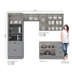 A Cozinha Compacta Emily 4 peças com Torre Quente possui 220,5 cm de Altura, 271,5 cm de Largura e 51 cm de Profundidade. Um novo conceito inspirado nas clássicas cozinhas estilo americano, seu design contemporâneo embeleza qualquer ambiente. Projetado para proporcionar praticidade e funcionalidade ao uso. Produto 100% MDF, disponibiliza de várias opções de módulos que possibilitam diversas composições lineares, possui detalhes usinados em baixo relevo nas portas e gavetas, puxadores nos balcões em formato de concha e nos aéreos são pontuais, ambos na cor ouro velho, possui dobradiças de 35mm com amortecimento, aéreos com 830mm de alturas, gavetas com corrediças telescópicas proporcionando maior abertura. A sua instalação pode ser feita tanto com o uso dos rodapés ou suspensa.