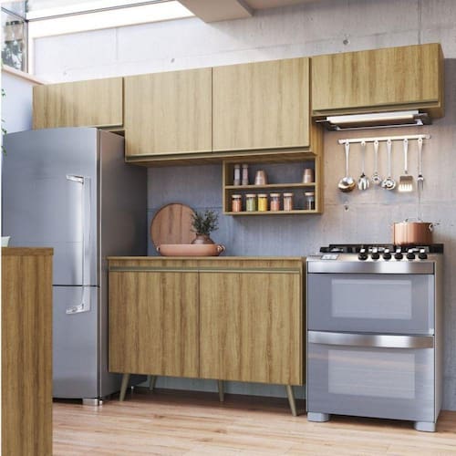 Possui puxador em perfil PVC, corrediça telescópica, dobradiça metálica e pé estilo retrô. Sua estrutura em MDP de 15mm possui acabamento finish foil. Disponíveis nas cores Verde Bellagio, Teka e Cinnamon, tons exuberantes e cheios de energia que colorem trazendo mais vida a sua cozinha. Altura do Conjunto: 200 cm Ambiente: null Ambiente Principal: Cozinha Cor: Teka Informação Complementar: 1x Balcão 2 Portas com Tampo 120 cm One TekaLargura: 120Altura: 87.5Peso: 37.4Profundidade: 52Necessita Montagem: Sim2x Armário Aéreo Basculante 1 Porta 70cm One TekaLargura: 70Altura: 34Peso: 8.699999999999999Profundidade: 31.5Necessita Montagem: Sim1x Armário Aéreo 2 Portas 120 cm One TekaLargura: 120Altura: 54Peso: 22Profundidade: 31.5Necessita Montagem: Sim1x Aéreo Porta Temperos e Condimentos One TekaLargura: 60Altura: 33.5Peso: 3.7Profundidade: 15Necessita Montagem: Sim Suporta Até (kg): 05