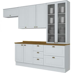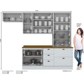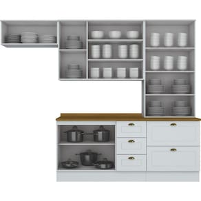 Um novo conceito inspirado nas clássicas cozinhas estilo americano, seu design contemporâneo embeleza qualquer ambiente. Projetado para proporcionar praticidade e funcionalidade ao uso. Produto 100% MDF, possui detalhes usinados em baixo relevo nas portas e gavetas, puxadores nos balcões em formato de concha e nos aéreos são pontuais, ambos na cor ouro velho, possui dobradiças de 35mm com amortecimento, aéreos com 830mm de alturas, gavetas com corrediças telescópicas proporcionando maior abertura. A sua instalação pode ser feita tanto com o uso dos rodapés ou suspensa. Este produto foi desenvolvido para atender os mais criteriosos usuários aliando funcionalidade com elegância. Acabamento da Prateleira: Pintura Texturizada UV Ambiente Principal: Cozinha codigo_ean: 7908506265523 Cor: Branco HP/Marrom Cor do Produto: Branco HP/Marrom Informações Complementares: 1 Aéreo 1 Porta Basculante 34cmx80cmx32,5cm; 1 Aéreo 3 Portas 83cmx120cmx32,5cm; 1 Balcão Pia 3 Gavetas 2 Portas com Tampo 82cmx120cmx51cm; 1 Cristaleira 2 Portas 2 Gavetas 220,5cmx71,5cmx54cm Manual de Montagem e Instalação: https://product-hub-prd.madeiramadeira.com.br/700005/documents/269c6bad-35ca-436f-948e-8605439661c1haemily5peascomcristaleira.pdf Material da Prateleira: MDF Peso Máximo por Prateleira: 8 kg Possui Prateleiras: Sim Tipo de Dobradiça da Porta: Metálica