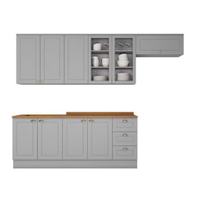 Composição do Kit -AxLxP-: 1 Aéreo 02 Portas 83 x 80 x 32,5 Cm; 1 Aéreo 03 Portas 83 x 120 x 32,5 Cm; 1 Aéreo 01 Porta Basc. 34 x 80 x 32,5 Cm; 1 Balcão Pia 02 Portas e 03 Gavetas 82 x 120 x 51 Cm; 1 Balcão 02 Portas 82 x 80 x 51 Cm; 1 Tampo 2,5 x 120 x 53,5 Cm; 1 Tampo 2,5 x 80 x 53,5 Cm;