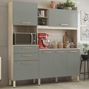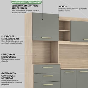 Cozinha Compacta Selecta, com distribuição pensada para se ter o máximo de aproveitamento interno, estrutura em MDP de 12 mm e 15 mm, e acabamento em pintura UV (Fosco). Equipada com 06 portas articuladas com dobradiças metálicas, sendo uma porta superior com pistão a gás, 02 gavetas com corrediças metálicas, puxadores em plásticos ABS, conta com espaço para forno ou micro-ondas, possui nichos externos, e a interna conta com prateleira e compartimentos muito bem divididos, tem tampo superior rebaixado garantindo mais espaço para organizar de forma decorativa, e acompanha pés com regulagem de altura. O visual moderno oferece sofisticação e bom gosto para a decoração da sua cozinha. Este móvel chegará em sua casa separado em 02 volumes.