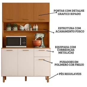 A Cozinha Compacta Livi é a solução ideal para quem busca praticidade e estilo. Com 6 portas de bater e 1 gaveta com corrediças metálicas 30mm, oferece amplo espaço de armazenamento e se destaca pelo detalhe ripado gráfico nas portas superiores, que agrega um toque moderno ao ambiente. Além disso, conta com um nicho organizador decorativo (A.19 x L.108 x P.13 cm) e um espaço perfeito sobre o balcão (A.40 x L.108 x P.26 cm) para aparelhos e utensílios domésticos. Para maior resistência e praticidade, o produto conta com dobradiças metálicas reforçadas de 26 mm, puxadores em polímero ouro fosco e pés reguláveis em PVC de 17 cm, garantindo o nivelamento ideal e um acabamento sofisticado. Sua estrutura em MDP 15mm e portas com pintura UV acetinada oferecem não apenas durabilidade, mas também um acabamento fácil de limpar. Ideal para quem busca aliar estética e praticidade, transformando a cozinha em um espaço agradável e eficiente. Este móvel chegará em sua casa separado em 1 volume.