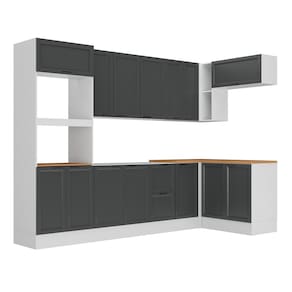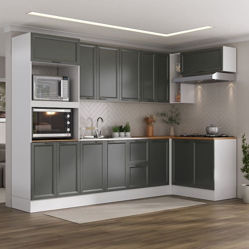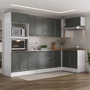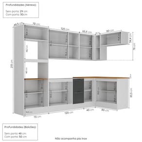 Informações Complementares: Portas de bater almofadadas/molduradas em MDF; balcão 80cm e balcão canto com tampo de 27mm de espessura; balcão 120cm sem tampo ideal para pia que atenda a medida de 120x50cm; aéreo canto e balcão canto reversíveis direita/esquerda; corrediças telescópic