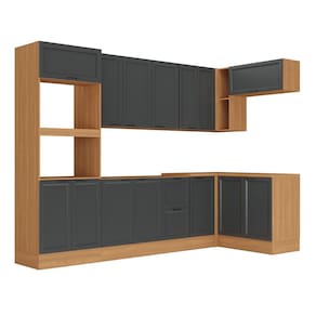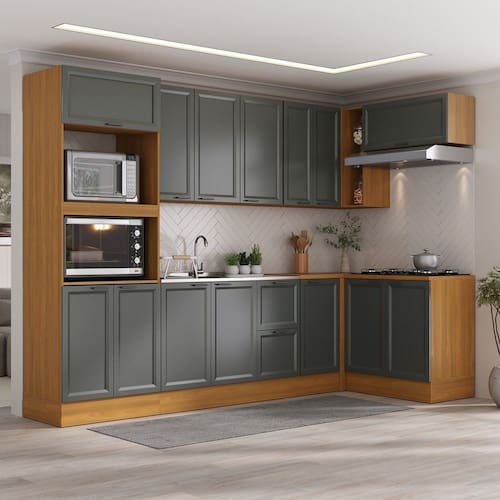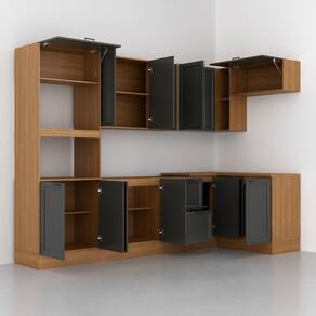 Informações Complementares: Portas de bater almofadadas/molduradas em MDF; balcão 80cm e balcão canto com tampo de 27mm de espessura; balcão 120cm sem tampo ideal para pia que atenda a medida de 120x50cm; aéreo canto e balcão canto reversíveis direita/esquerda; corrediças telescópic