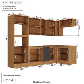 Medida de cada item (A x L x P): Torre Quente: 213cm x 70cm x 50cm; Aéreo triplo: 76cm x 120cm x 31cm; Aéreo canto: 76cm x 95cm x 31cm; Aéreo Geladeira: 34cm x 80cm x 31cm; Balcão: 84cm x 120cm x 50cm; Balcão canto: 86cm x 95cm x 50cm; Balcão 80cm: 86cm x 80cm x 50cm; Tampo: 2,7cm x 80cm x 50cm.
