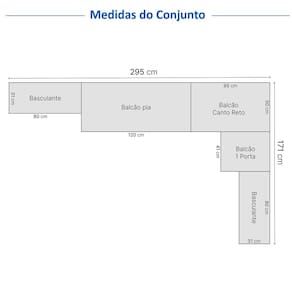 Medida de cada item (A x L x P): Aéreo Geladeira: 34cm x 80cm x 31cm; Aéreo Geladeira: 34cm x 80cm x 31cm; Aéreo triplo: 76cm x 120cm x 31cm; Aéreo canto: 76cm x 95cm x 31cm; Aéreo 1 porta: 76cm x 41cm x 31cm; Balcão 120cm: 84cm x 120cm x 50cm; Balcão canto: 86cm x 95cm x 50cm; Balcão 1porta: 86cm x 41cm x 50cm.