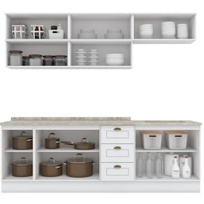 *O tampo da cozinha é de BP. Acabamento da Prateleira: Pintura Texturizada UV Escala de Brilho da Prateleira: Fosco Acabamento da Gaveta: Pintura Texturizada UV Escala de Brilho da Gaveta: Fosco Material do Puxador da Gaveta: Metal Acabamento da Porta: Pintura Texturizada UV Escala de Brilho da Porta: Fosco Material do Puxador da Porta: Metal Acabamento dos Pés: Pintura Acompanha Tampo: Sim Ambiente Principal: Cozinha codigo_ean: 7908388192344 Complexidade da Montagem: Alta: deve ser montado por um montador especializado Cor: Branco HP/Calcare Cor do Produto: Branco HP/Calcare Cor Interna: Branco Escala de Brilho: Fosco Gaveta com Chave: Não Informações Complementares: Atenção: A cozinha acompanha tampo porém NÃO acompanha a pia com cuba. Itens Inclusos: 1 Balcão para Pia, 1 Balcão 2 Portas, 1 Balcão 1 Porta, 1 Aéreo 3 Portas, 2 Aéreos 1 Porta Basculante, 1 Aéreo 1 Porta, Kit Ferragens e Manual de Montagem Linha ou Coleção: Emily - Henn Manual de Montagem e Instalação: https://product-hub-prd.madeiramadeira.com.br/627114/documents/2adbe8af-1d68-497e-820d-7fa5dd330571372cozinhacompactaemily8ps.pdf Material da Dobradiça/Corrediça da Porta: Metálica Material da Gaveta: MDF Material da Porta: MDF Material da Prateleira: MDF Material do Fundo: MDF Material do Tampo: MDF Material dos Pés: MDF Medida de cada item (A x L x P): 1 Balcão 2 Portas 82cm x 80cm x 51cm com Tampo; 1 Balcão 2 Portas 3 Gavetas 82cm x 120cm x 51cm com Tampo; 1 Aéreo 2 Portas 83cm x 80cm x 32,5cm e 1 Aéreo 3 Portas 83cm x 120cm x 32,5cm modular: Sim Necessita Montagem: Sim O Balcão Acompanha Pia: Não Origem do Produto: Nacional Pés Reguláveis: Não Peso: 150 kg Peso Máximo por Gaveta: 3 kg Peso Máximo por Prateleira: 8 kg Possui Pés: Rodapé Possui Portas: Sim Possui Prateleiras: Sim Possui recorte para Cooktop: Não Possui Vidro: Não Produto Montado: Sim Recomendações de Uso, Manutenção e Limpeza: Para limpeza de seu móvel, use uma flanela seca ou umedecida. Não utilize produtos químicos que possam danificar o produto. Resistente à Chuva: Não Sapatas Niveladoras: Não Sistema de Montagem: Parafusos e Cavilhas Suporta Até (kg): 177 kg Tamanho Indicado da Pia: 120cm x 53cm Tamanho Indicado do Tampo: 120cm x 53cm Tamanho Indicado do Tampo ou Pia: Tampo Indicado (LxP) 120x53,5cm Tipo de Corrediça: Metálica Telescópica Tipo de Corrediça da Gaveta: Metálica Telescópica Tipo de Dobradiça: Metálica Tipo de Dobradiça/Corrediça da Porta: Soft close Tipo de Puxador da Gaveta: Externo Tipo de Puxador da Porta: Externo