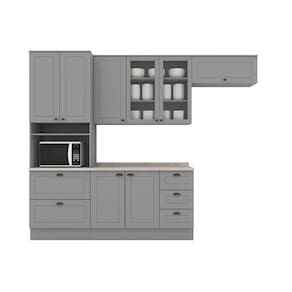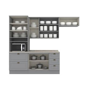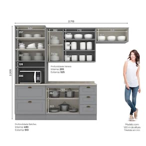 Medida de cada item (A x L x P): 1 Aéreo 3 portas 83x120x32,5 cm, 1 Balcão Pia 03 Gav e 02 Ptas 82x120x51 cm C/ tampo, 1 Aéreo Basculante 34x80x32,5 cm, Torre Quente 2 Ptas 2 gav 220,5x71,5x51 cm.