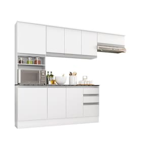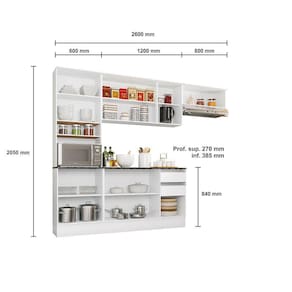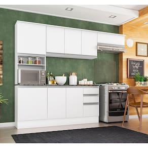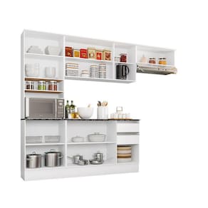 Composto por: Paneleiro duplo com prateleiras (nicho organizador e espaço para micro-ondas) Aéreo triplo e aéreo basculante 1 porta com pistão a gás Balcão possui 3 portas 2 gavetas com tampo