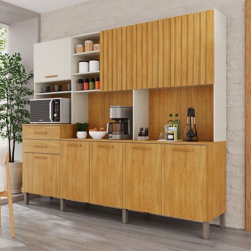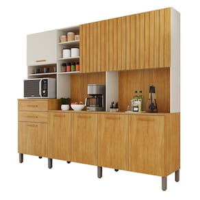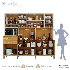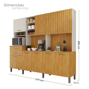 Transforme o estilo e a funcionalidade da sua cozinha com o Kitão Louvre. Este móvel é a combinação ideal de praticidade e elegância, projetado para atender às suas necessidades diárias. Com 2 gavetas que possuem corrediças telescópicas e 9 portas, incluindo um espaço específico para o micro-ondas, o Kitão Louvre oferece amplo armazenamento para todos os seus utensílios de cozinha. A pintura UV de alta qualidade proporciona um acabamento durável e resistente, enquanto os pés ajustáveis garantem estabilidade e adaptabilidade ao seu espaço. Com 3 prateleiras internas, você pode organizar seus itens de maneira eficiente. As portas superiores apresentam detalhes ripados elegantes, que acrescentam um toque de sofisticação ao ambiente. Acabamento da Prateleira: Pintura UV Escala de Brilho da Prateleira: Semi-Brilho Acabamento da Gaveta: Pintura Texturizada UV Acabamento da Porta: Pintura UV Escala de Brilho da Porta: Semi-Brilho Acompanha Tampo: Sim Ambiente Principal: Cozinha Balcão Suporta Pia: Não codigo_ean: 7900288121226 Complexidade da Montagem: Média: pode ser montado por mais de uma pessoa e/ou necessite de maior conhecimento para montagem Cor: Cinamomo / Off White Acetinado Cor do Produto: Cinamomo / Off White Acetinado Escala de Brilho: Semi-Brilho Gaveta com Chave: Não Itens Inclusos: 1 Kit de Cozinha, Manual de Montagem e Kit Ferragens. Manual de Montagem e Instalação: https://product-hub-prd.madeiramadeira.com.br/729501905/documents/eda750dc-9959-4519-9839-ca12baa908a82853265524617446626467721.pdf Marca: CHF Material da Dobradiça/Corrediça da Porta: Metálica Material da Gaveta: MDP Material da Porta: MDP Material da Prateleira: MDP Material do Tampo: MDP Material dos Pés: Polipropileno modular: Não Necessita Montagem: Sim O Balcão Acompanha Pia: Não Origem do Produto: Nacional Pés Reguláveis: Sim Peso: 105,4 kg Peso Máximo por Gaveta: 3 kg Peso Máximo por Prateleira: 5 kg Possui Pés: 08 Possui Portas: Sim Possui Prateleiras: Sim Possui recorte para Cooktop: Não Possui Rodízio: Não Produto Montado: Sim Recomendações de Uso, Manutenção e Limpeza: Pano levemente umedecido, não utilizar solventes nem produtos de limpeza. Sapatas Niveladoras: Não Sistema de Montagem: Parafusos e Cavilhas. Tamanho Indicado da Pia: 40 x 40 Tipo de Corrediça da Gaveta: Metálica Telescópica Tipo de Dobradiça da Porta: 35 mm Tipo de Puxador da Gaveta: Externo Tipo de Puxador da Porta: Externo