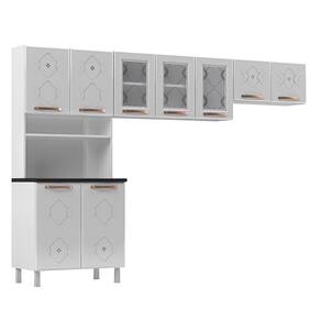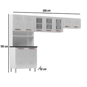 A Cozinha Mirage é sinônimo de qualidade, resistência e brilho para a sua cozinha. enbsp; Essa composição conta com 3 módulos robustos - fabricados inteiramente em aço - que passam por pintura eletrostática de acabamento brilhoso, um processo que confere qualidade, proteção anticorrosiva e mais resistência ao móvel. Internamente, é possível acomodar panelas, louças, travessas ou alimentos - de maneira organizada e funcional. O módulo Kit é um aliado no dia a dia: com espaço para micro-ondas, forno ou qualquer eletro que você precise ter sempre ao alcance das mãos – de forma prática e ergonômica, ele é amplo e robusto. Já o armário aéreo é um daqueles módulos queridinhos para armazenar e também decorar a cozinha, além dos belos vidros serem serigrafados e temperados, para maior segurança. As delicadas serigrafias harmonizam com os apliques em alto relevo e puxadores em Rosé. Uma cozinha para fazer a vida brilhar!