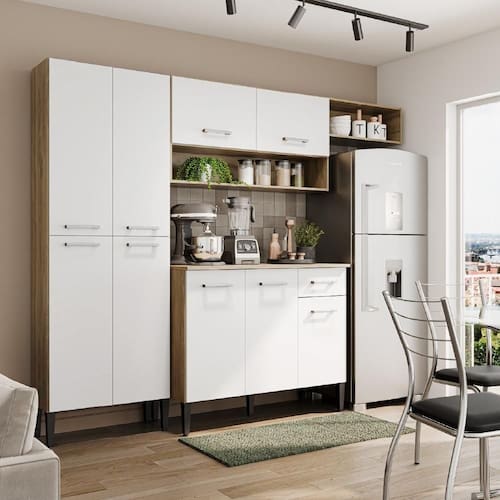 A Cozinha Compacta Arizona Glam da Carraro é o item perfeito para quem está procurando funcionalidade, organização e estilo para ambientes compactos. O produto é composto por um paneileiro com 4 portas, um balcão de pia com gaveiteiro, um armário aéreo e um nicho.