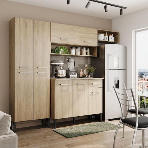 A Cozinha Compacta Arizona Glam da Carraro é o item perfeito para quem está procurando funcionalidade, organização e estilo para ambientes compactos. O produto é composto por um paneileiro com 4 portas, um balcão de pia com gaveiteiro, um armário aéreo e um nicho.
