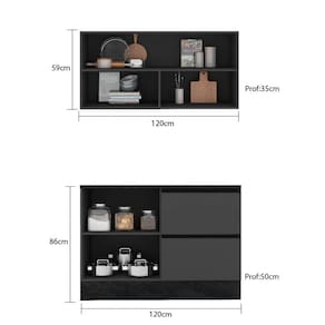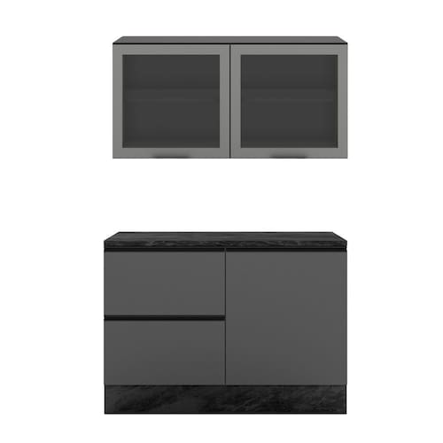 Balcão com tampo, porta de bater, dobradiças resistentes de 35mm com a função slow motion, prateleira, porta talher, gavetas com corrediças telescópicas, pés PVC reguláveis, rodapés removíveis com presilhas modelo click.