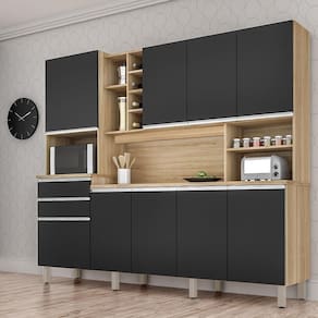 Cozinha completa que concilia organização com elegância, muitos nichos com tamanhos variados e amplo espaço interno para guardar seus utensílios e deixar a mostra seus objetos de decoração favoritos