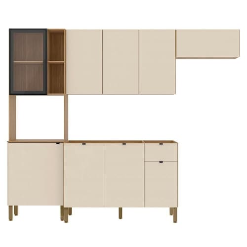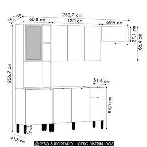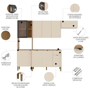 O Armário Aéreo possui três portas convencionais, enquanto o Armário de Geladeira apresenta uma porta basculante, todas passantes, dispensando o uso de puxadores, o que dá à composição um visual contemporâneo. O Balcão Para Pia vem com três portas convencionais com puxadores em alumínio e uma gaveta. Não acompanha tampo para que o uso fique opcional com tampo ou pia.