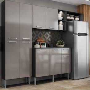 Conteúdo da Embalagem: 1 (um) armário aéreo com nicho lateral e horizontal de 166 cm 1 (um) paneleiro duplo de 62 cm 1 (um) balcão com tampo de 105 cm 1 (um) kit com 2 Luminárias LED