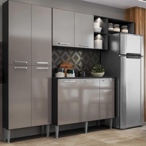 A Cozinha Completa Compacta com 2 Leds, Armário e Balcão com Tampo 3 peças Pequim Multimóveis tem um excelente custo benefício e um amplo espaço interno. Os módulos são individuais e você pode montar da maneira que se adaptar melhor ao seu ambiente (exceto o nicho para fogão/geladeira que é anexo ao armário aéreo). Produzida em MDP com acabamento acetinado (cerca de 20% de brilho), que garante maior durabilidade e resistência, possui corrediças metálicas (mais leveza no manuseio), pés com regulagem de altura de 17 a 20 cm (permitem um perfeito nivelamento dos módulos), puxadores em ABS com acabamento cromado e tampos em MDP 15mm com pintura de alta resistência. Para deixar sua cozinha mais bonita e organizada, possui compartimento especial para utensílios mais altos e módulo aéreo com nichos. As luminárias em LED, que acompanham a cozinha, proporcionam um visual mais bonito e moderno, deixando o ambiente aconchegante e confortável. Com design minimalista e de fácil instalação, você pode escolher em qual lugar do móvel deseja fixar. Com luz brilhante, a luminária funciona com 3 pilhas AAA que já estão inclusas.